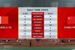 體育資訊11月22日訊 U17亞預(yù)賽第一輪,國(guó)少隊(duì)半場(chǎng)3-0領(lǐng)先巴林隊(duì),數(shù)據(jù)方面,國(guó)少隊(duì)半場(chǎng)13射4正3進(jìn)球,對(duì)手0射門(mén)。